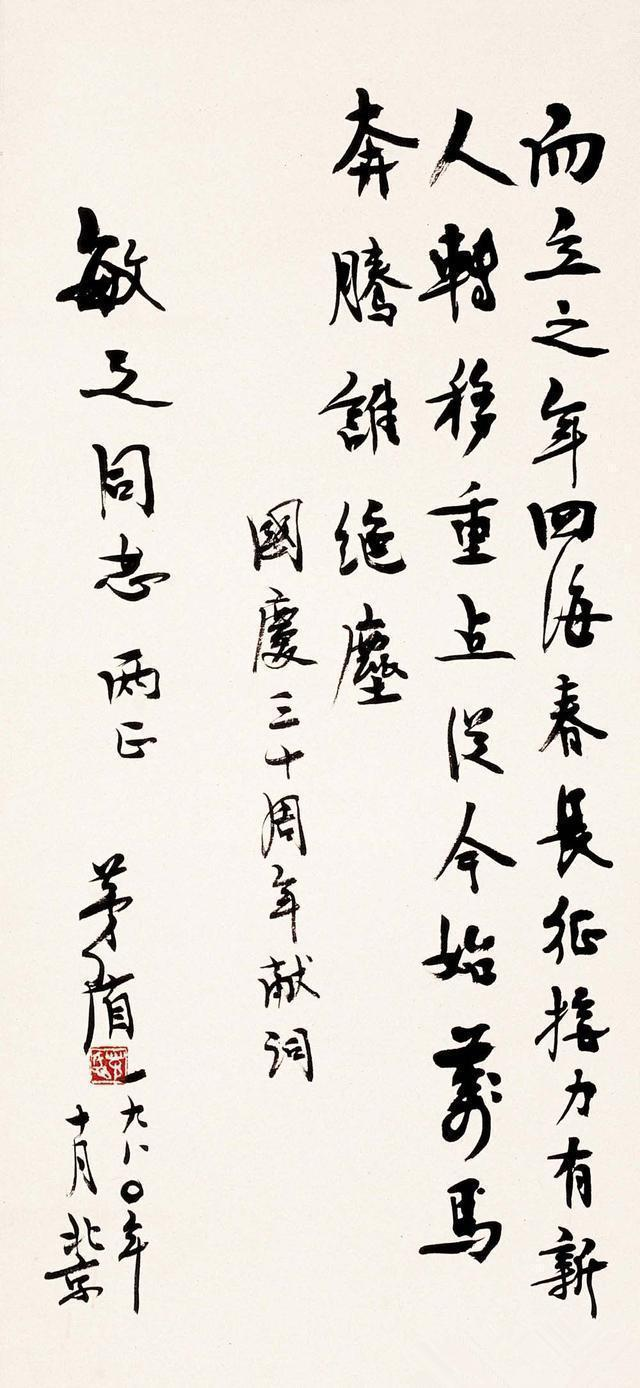 茅盾写字是为实用,并不当作是艺术创作,对笔墨纸砚不考究。谈及自己书法,他曾说“不成什么体,瘦金看过,未学,少年时曾临董美人碑,后来乱写。”甚至说自己“写字如腾云,殊可笑也。” 茅盾书法,却功底十足,独具风姿,文学和书法同辉。他中学时的篆刻老师邓石如,正是江南书法、篆刻大家。茅盾将文学书写与书法书写进行了成功的结合,并且都将“在墨迹中永生”。而更重要的是,茅盾作为跨越民国、共和两个时代的高寿文人,他的书写人生在传承中国文人书法文化方面也堪称是最为杰出的一个代表。