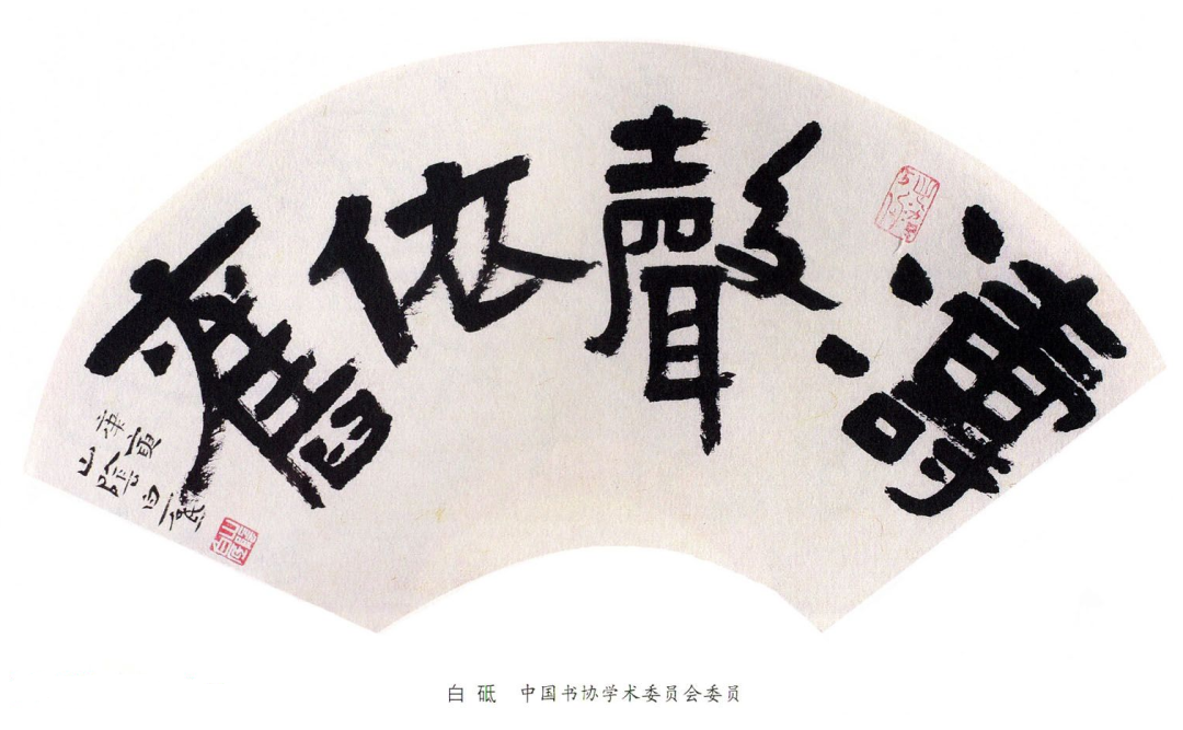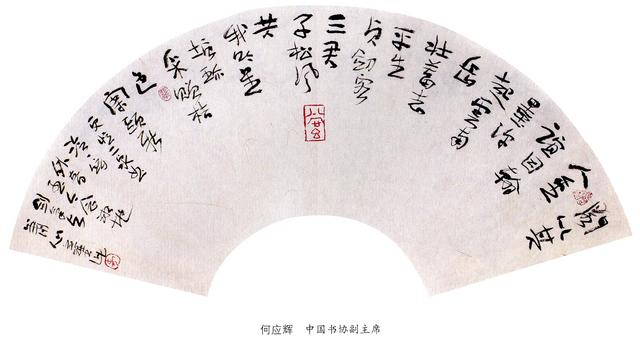 扇面书体的选择,应根据创作的风格及书写内容而定,达到和谐美。在一幅作品中,也可以同时使用擅长的两种书体。如,正文大面积写篆书或草书,同时以小面积书写小楷或行书做辅助,块面之间拉开距离。由于存在不同的书体、动静的对比以及多少的变化,画面就会变得十分丰富,耐人寻味,同时也反映出作者的创作实力。需要注意的是,扇面书法的书体一般不宜用狂草,切忌真草隶篆一起上,主次不分。
