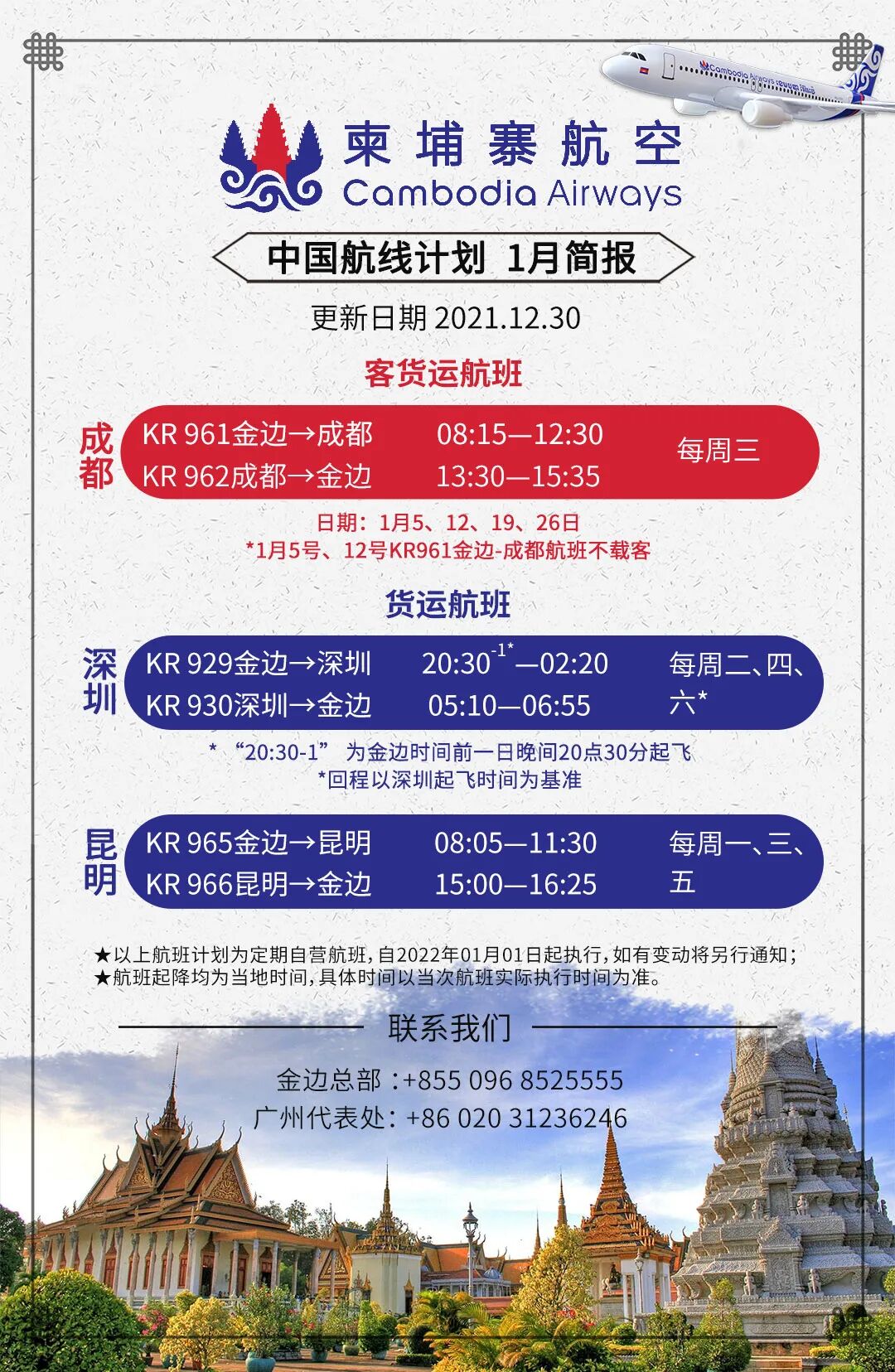 柬埔寨航空1月航班最新时刻如下,起飞降落均为当地时间。您可以通过柬航官网查询航班动态或预订机票。感谢您的理解与支持!
