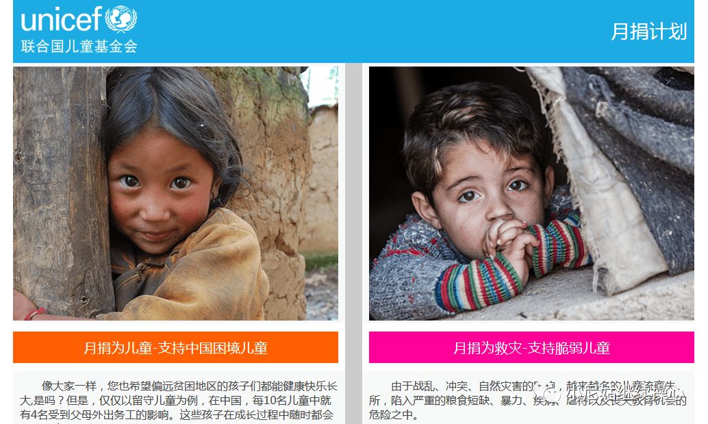 直到今天,我在浏览网易新闻的时候,发现了联合国儿童基金会的网站入口,看到那些天真的无助孩子的眼神,我再也忍不住泪奔,我点开了月捐计划,以小熊猫的名义提交了月捐计划,希望可以帮助更多需要帮助的孩子,也希望可以减轻自己当初选择离去的那份愧疚。我不想号召我的读友们去捐款,我只是为自己更有勇气面对自己而高兴,希望这份善行可以温暖并照亮这些孩子的人生,仅此而已。有一天当你觉得自己一无是处碌碌无为的时候,想到远方有个孩子会因为你的帮助过的好一些的时候,也许心里的那份失落和懊恼会减少一点。