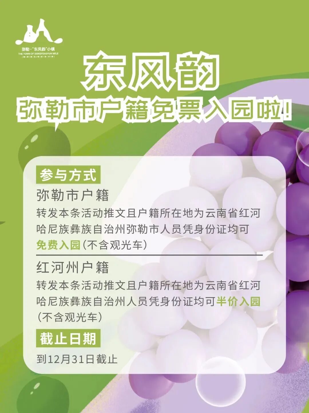 在弥勒市区可乘坐东风1号线(票价5元/人),到东风韵站下车走5分钟左右即可到达。
