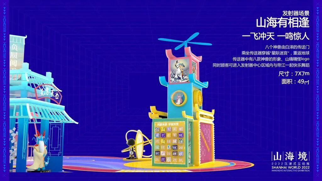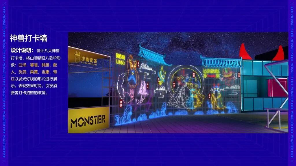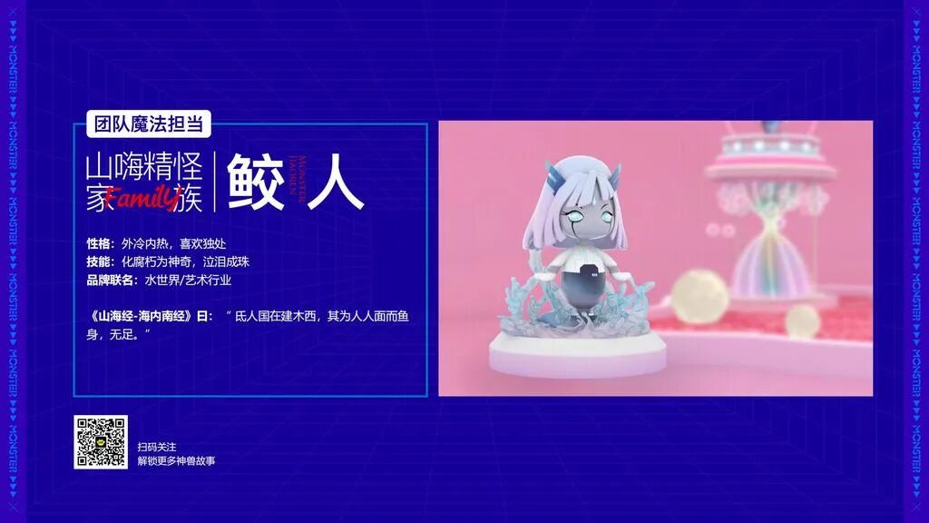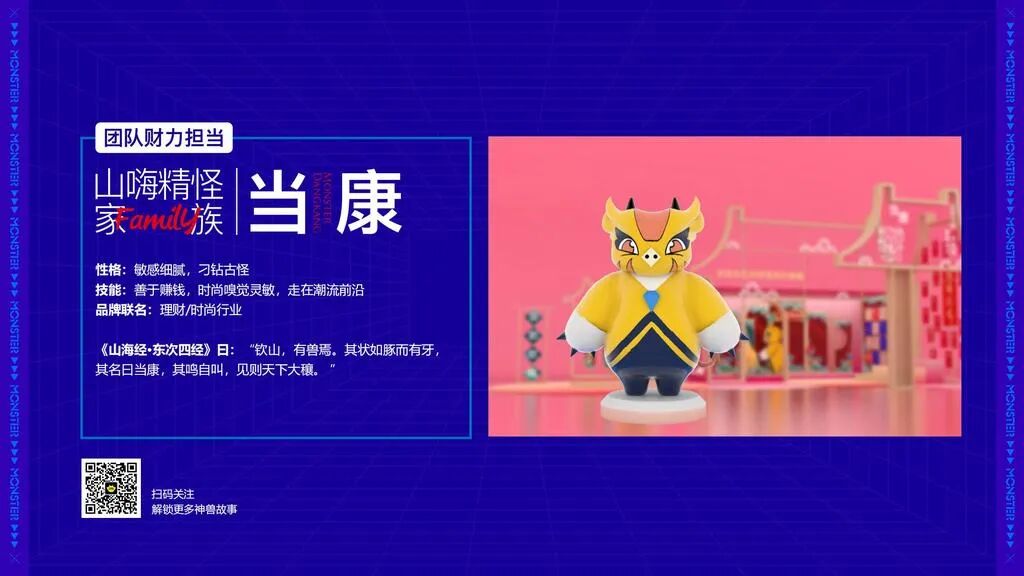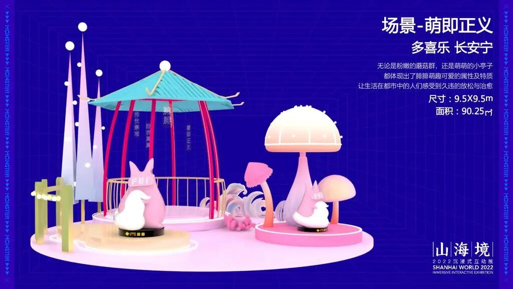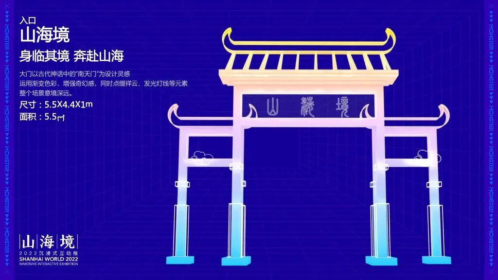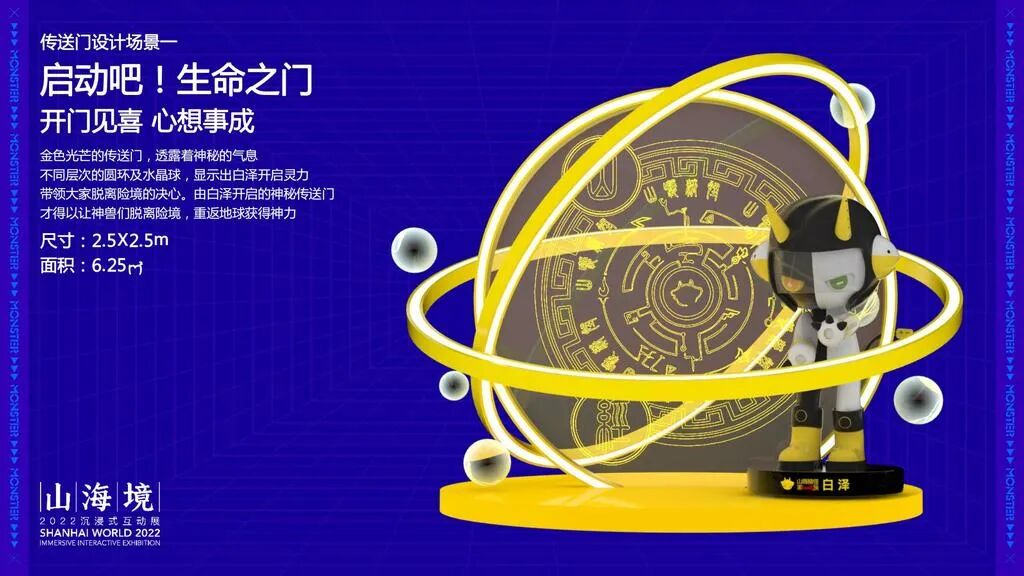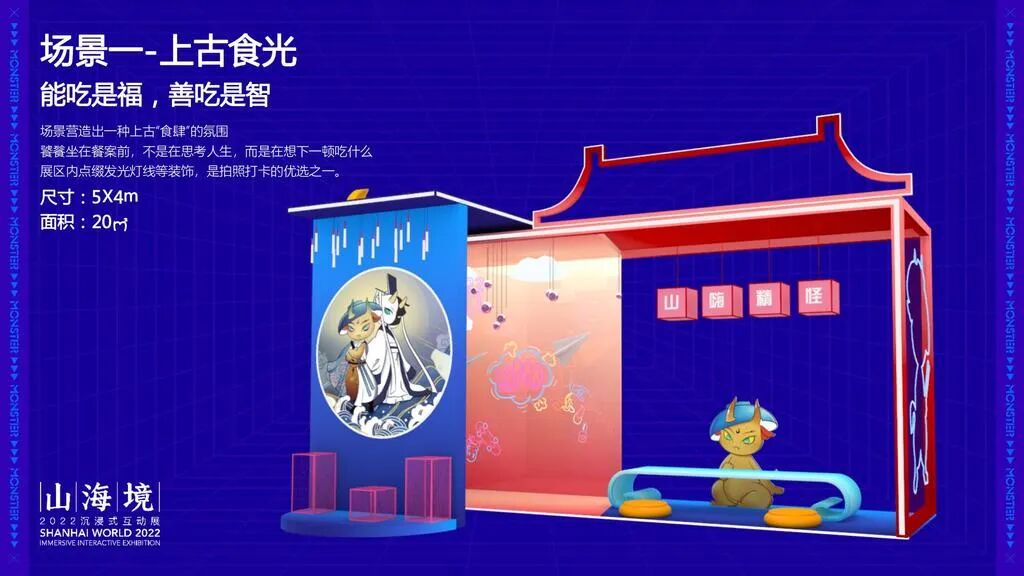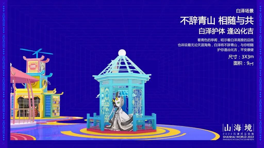 依托《山海经》,汲取了以为白泽为首的上古神兽(鲛人、当康、乘黄、帝江、饕餮、腓腓)进行二次创作,并根据这些上古神兽的特点匹配了不同的行业,打造深度的沉浸式主题展。