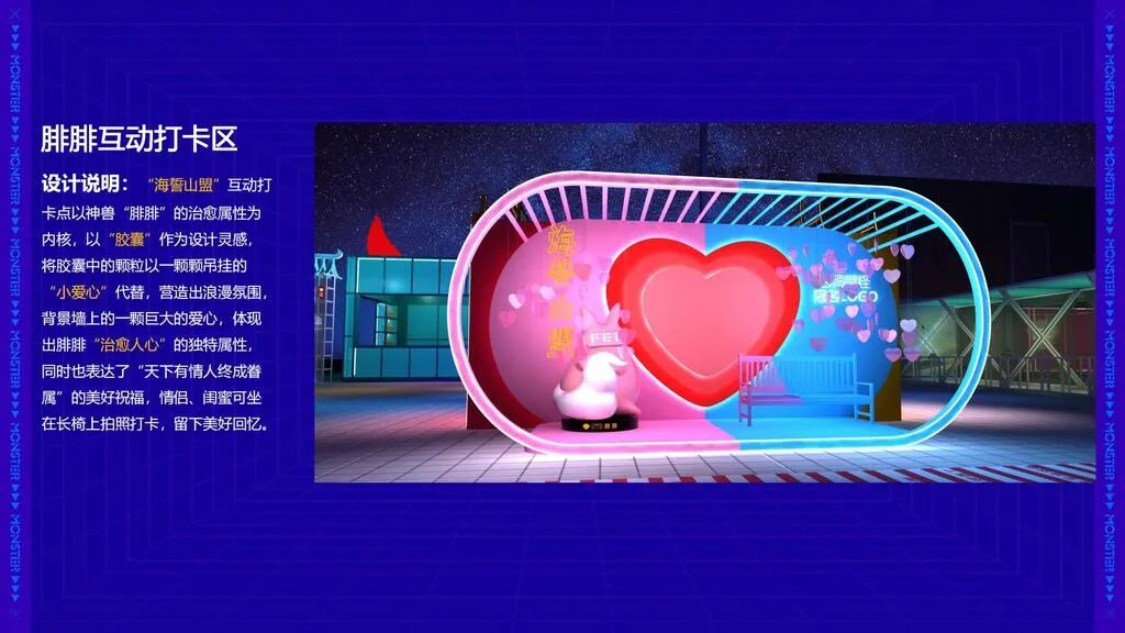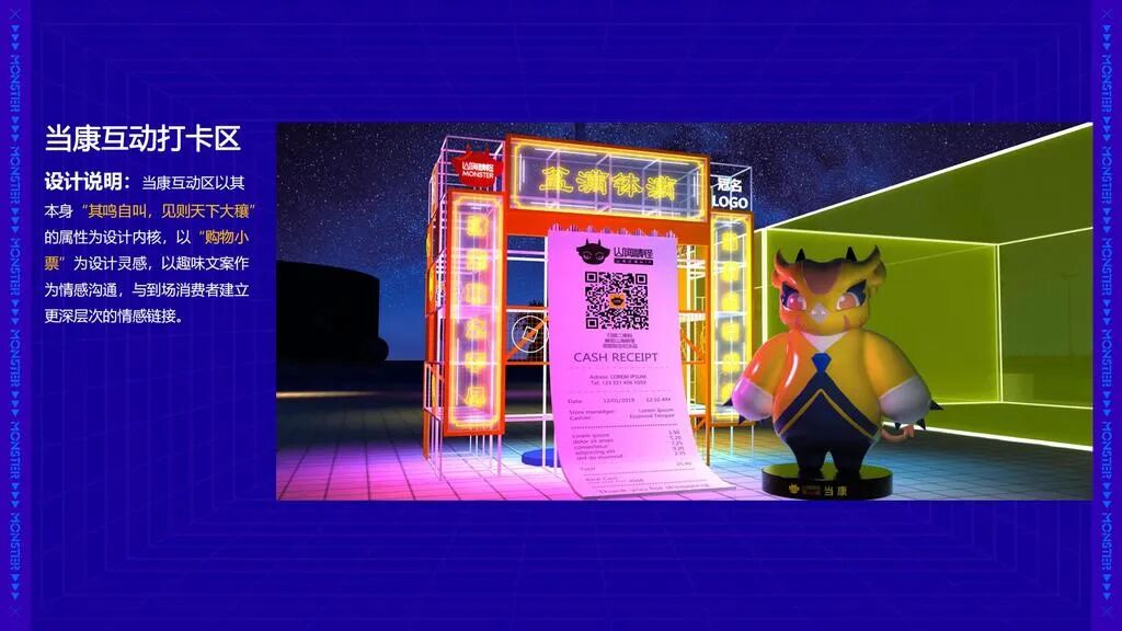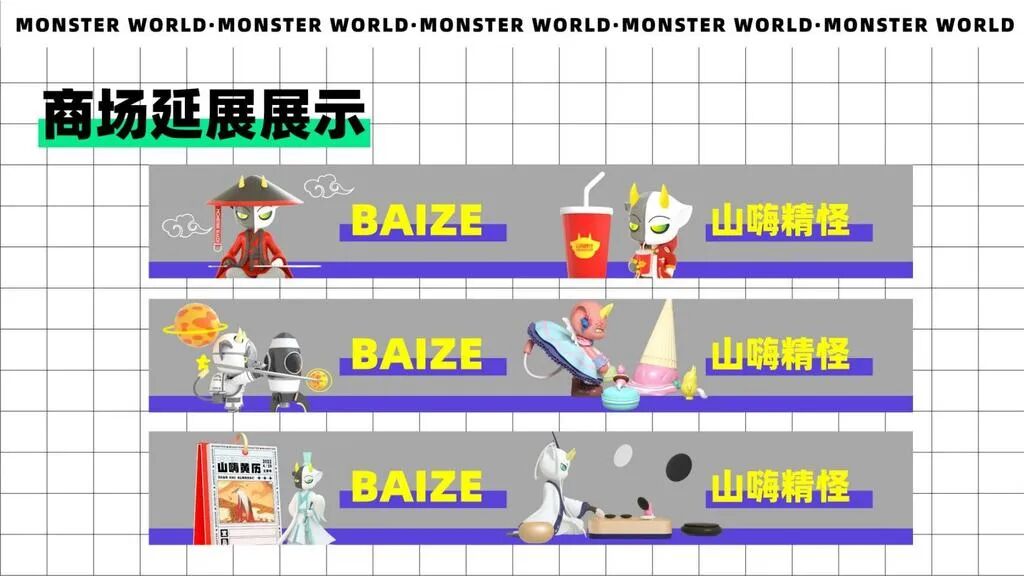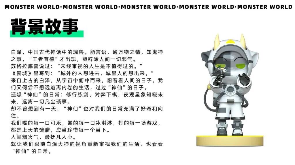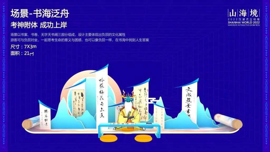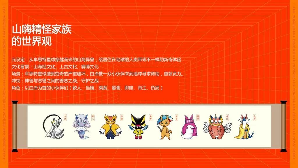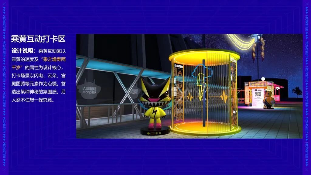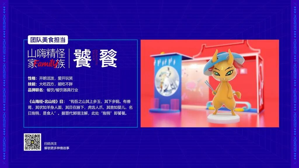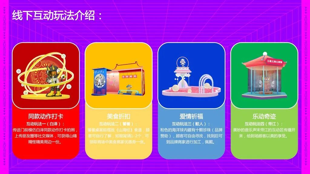 依托《山海经》,汲取了以为白泽为首的上古神兽(鲛人、当康、乘黄、帝江、饕餮、腓腓)进行二次创作,并根据这些上古神兽的特点匹配了不同的行业,打造深度的沉浸式主题展。