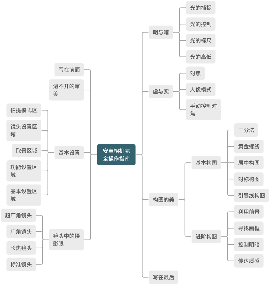 当然按照我的写作习惯,我在前面放上一张全文的思维导图,它是我们这趟旅行的重要指南针,希望你可以先从全局上对于拍照这件事有一个把握。