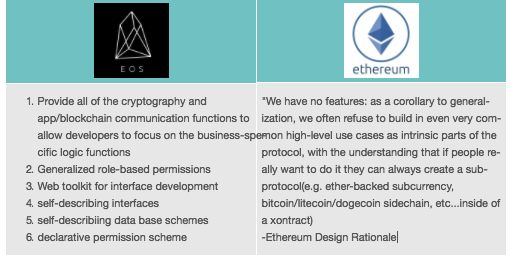 EOS和ETH以太坊网络之间的主要区别之一在于网络背后的设计理念。以太坊网络几乎可以被描述为与应用无关,也就是说它被专门设计为所有潜在应用的中立平台。正如github上Ethereum Design Rationale文档所说:Ethereum没有“特性”,拒绝构建“甚至是非常常见的,作为内在的协议部分”。