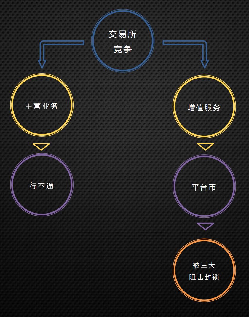 然而,如果从行业发展的角度来看,平台币发展成目前这个样子,对于那些要突围的小交易所而言,实际上是一次不算成功“起义”:对于二三线交易所而言,探索增值服务的初衷是就是为了避免跟龙头们在其最擅长的主营业务上正面交锋,所以才意图以平台币为入口,在增值服务上进行侧翼突破(所以可以看到,最早模仿币安搞平台币的都是中小交易所),结果这条侧翼现在也遭到资源更强大的头部交易所阻击,使得这些巨头的地位反而更稳固了,怎么办?