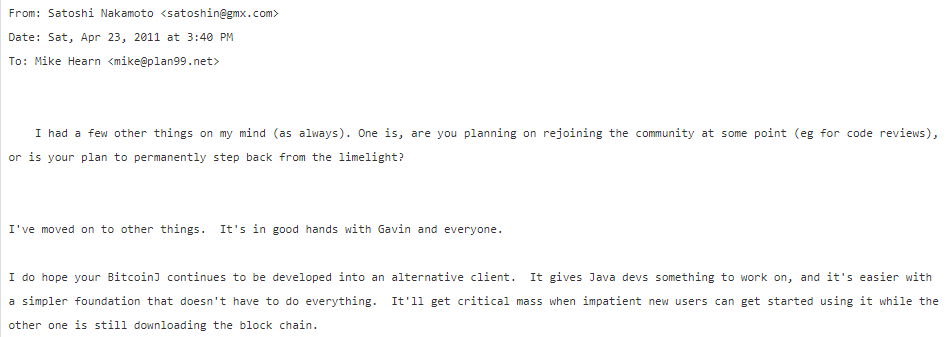 2011年4月20日,Mike Hearn又给中本聪发了一封邮件。在邮件中,他说:“I had a few other things on my mind (as always). One is, are you planning on rejoining the community at some point (eg for code reviews), or is your plan to permanently step back from the limelight?( 我有几个事情想问问,一个是,你会重新回到比特币社区里来吗?比如做做代码审查,还是你打算永久退出了?)