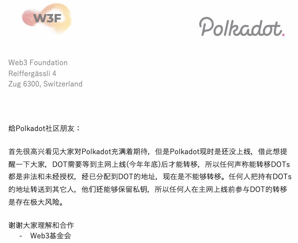 不过,波卡项目方立即做出了应对,波卡项目中国负责人 Anson 出面否认,并称波卡官方并没有授权任何机构出售,也没有和该交易平台有任何的合作以及授权,也不允许第二次销售 DOT(波卡的 Token 名称)。同时,波卡项目方也发出了正式声明,强调了相关风险。