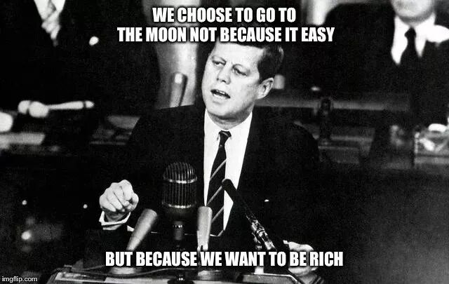 肯尼迪总统的原话说的是:“为什么我们会选择登月,不是因为它很简单,而是因为它很艰难。” 被比特币持有者们修改后,这句话变成了:为什么我们会选择登月,不是因为它很简单,而是因为我们想一夜暴富。