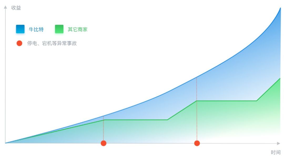 比较特别的一点是,在目前大多数云算力平台以「实际值」发放收益,牛比特小矿工一直基于「理论值」发放挖矿收益。简单来说,在矿机挖矿过程中可能面临众多不确定性因素,这些都会影响收益,比如矿场停电、矿机大范围宕机等异常事故可能会频繁影响收益率。部分云算力平台可能会让这些损失和用户一起分担,而小矿工直接由平台来承担这些事故带来的影响,把收益稳定、透明地给到用户手里。