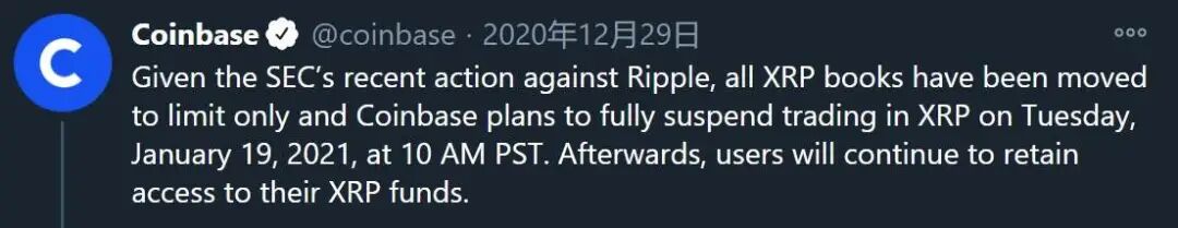 12 月 29 日,市场上传闻已久的消息终于尘埃落定,Coinbase 官宣将于 2021 年 1 月 20 日起暂停 XRP 交易。