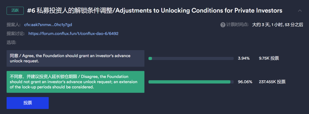 随后,由于团队官方认为此事件对 Conflux 社区引发了比较大的争议,于是发起了一个“早期投资人的解锁条件调整的” DAO 投票。目前,该投票已经结束,以96.06% 23 万 7 千余票 高票选择了“不同意,并建议投资人延长锁仓期限”的选项。