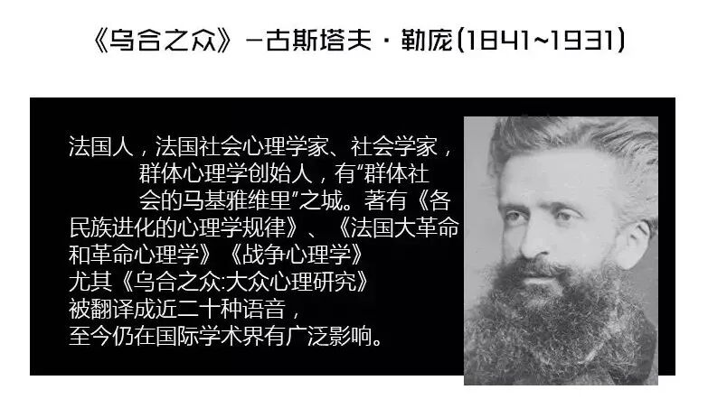古斯塔夫・勒庞 (Gustave Le Bon,1841-1931) ,法国著名社会心理学家。他自1894年始,写下一系列社会心理学著作,以《乌合之众》最为著名;