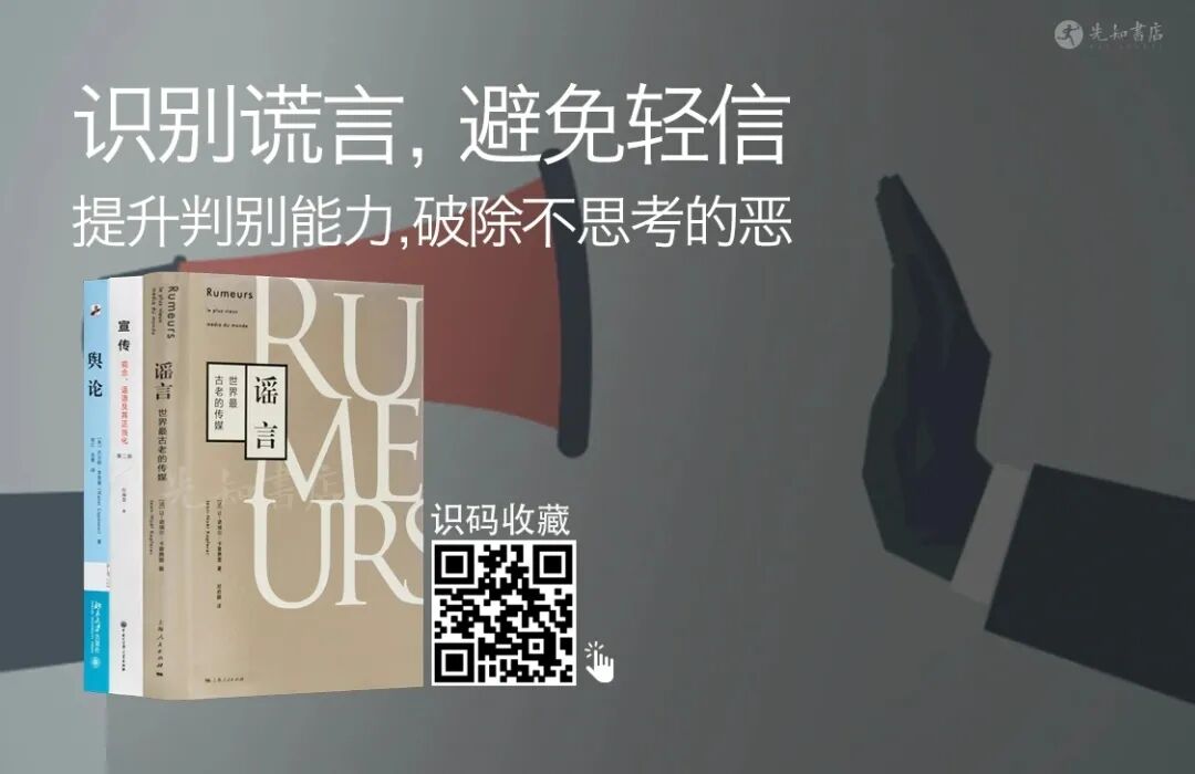 我在前面讲过:坏信息的秘诀,在于让你对号入座,先把自己安放进某个群体里面,再挑动起群体的对立,让你产生群体偏见,从而产生同仇敌忾的冲动。一旦有人企图给你归类、贴标签,告诉你:你是谁,你的敌人又是谁;一旦有人企图用“我们都是……的人”等言辞来跟你拉近距离;一旦有人让你注意自己的立场,别为对手说话,你没错,都是别人的错;无论是两性对立,劳资对立,地域对立,学历对立,甚至是爱国,娱乐,鄙视链……一切对立,背后都离不开「党同伐异」四个字。因为这些消息是如此狡猾以至于不仔细分辨普通人甚至难以察觉。就是因为符合了某些人的利益,或迎合人性而被当作事实。在无数人口口相传后,竟然变成了“真话”。很多人宁愿轻信,也不愿意独立思考。只用所谓的事实去评断一件事情的善恶,因为这样可以避免烧脑的思考。我们生活在信息爆炸的时代里,有官方制造的“宣传”,有媒体促成的“舆论”,还有各种小道“谣言”。要是这些信息,都照着单子全收,恐怕脑子就要不知不觉沦为他人思想的跑马场。那怎么办?我们应该先要彻底认识它们,然后在产生更正确的判断和决策。为此先知书店诚荐“破除谎言书单“:《谣言》:这本书是一本把“谣言”介绍得很清楚的书。作者用细腻幽默的笔触,为我们展现了谣言从诞生到沉寂的过程,以及在谣言的传播中涉及到的人群角色、深层心理原因以及不同维度的分类法,可谓一部“谣言小百科”。《宣传》:本书是目前我国此领域研究的最佳代表作。作者是人大新闻学院教授刘海龙老师。本书触及到了上世纪80年代中国现实语境和现实问题。对敏感问题没有任何回避。《舆论》:传播学领域的奠基之作。本书完成了新闻史上对舆论传播现象的首次全景式论述,自诞生以来,至今仍然保持着这个领域中的权威地位。识破谎言,破除不思考的恶。识别下图二维码,即可一键收藏。赞赏小编。