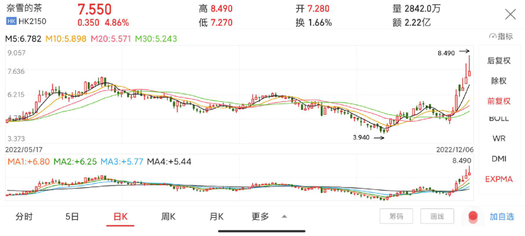 截止12月6日收盘,奈雪股价为7.55港元/股,期间盘中一度拉升至8.49港元/股,这创下了奈雪大半年时间以来的新高。