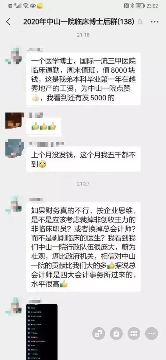 在网上流传的截图中,一位外科医生在群名为“2020年中山一院临床博士后群”的微信群里公开吐槽工资问题:“一个医学博士,国际一流三甲医院临床通勤,周末值班,值8000块钱……我看到还有发5000元的。”群里其他医生随后附议:“我也不清楚为什么上个月工资只发了1块钱”“上个月没发钱,这个月我五千都不到”……