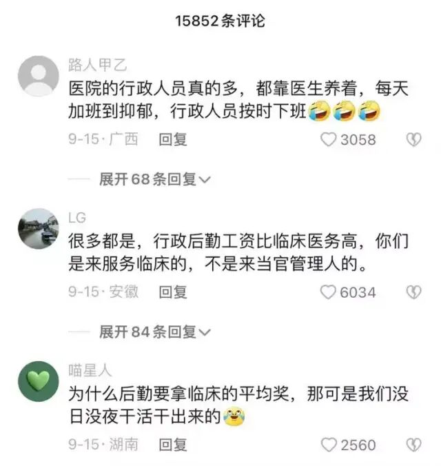 有的观点认为,有了后勤和行政的保障,医生的很多科研工作、医疗工作才可以正常开展。更多的网友则吐槽后勤拿的工资比医生还多:“医院的行政人员真的多,都靠医生养着,(医生)每天加班到抑郁,行政人员按时下班”“为什么后勤要拿临床的平均奖,那可是我们没日没夜干活干出来的”。