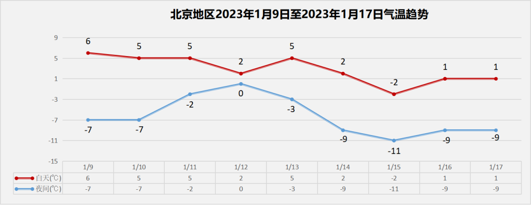 今天(1月9日),北京晴间多云,最高气温6℃,昼夜温差较大,最低气温仅-6℃,空气持续干燥,公众需及时补水。明后天,北京天空云量逐渐增多,白天气温小幅下降,气温波动,请注意及时增减衣物,谨防感冒。今天早晨,北京寒意十足,5时左右,南郊观象台气温为-3.5℃,城区气温在-3.8℃至0.6℃之间。北京市气象台预计,今天北京晴间多云,北转南风2、3级,昼夜温差较大。明后天北京天空云量逐渐增多,最高气温小幅下降。气象部门提醒,今明两天北京大气扩散条件逐渐转差,市民外出需加强健康防护,早出晚归谨防感冒,居家注意用火用电安全。根据最新的气象资料分析,本周中后期北京将有较强冷空气活动,气温明显下降,请及时关注临近预报预警信息。