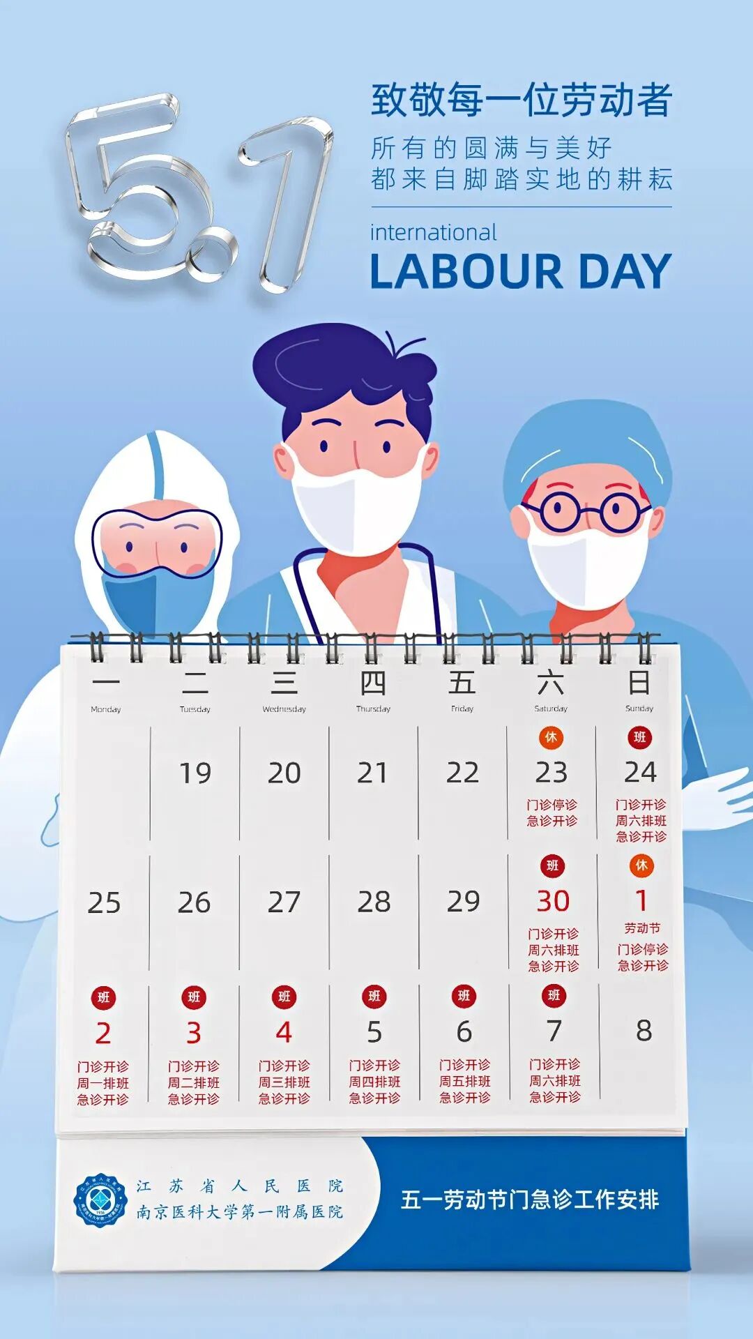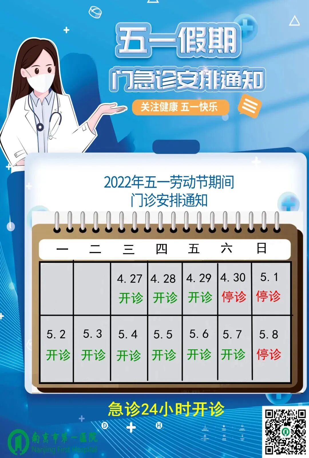 4月30日(周六)下午——5月4日(周三)门(急)诊、发热门诊正常开放,班次不变。