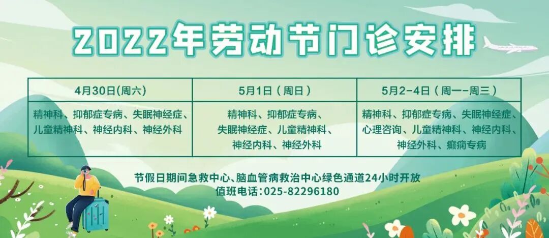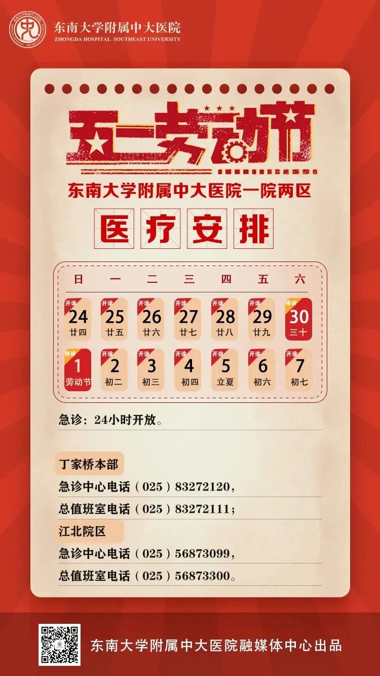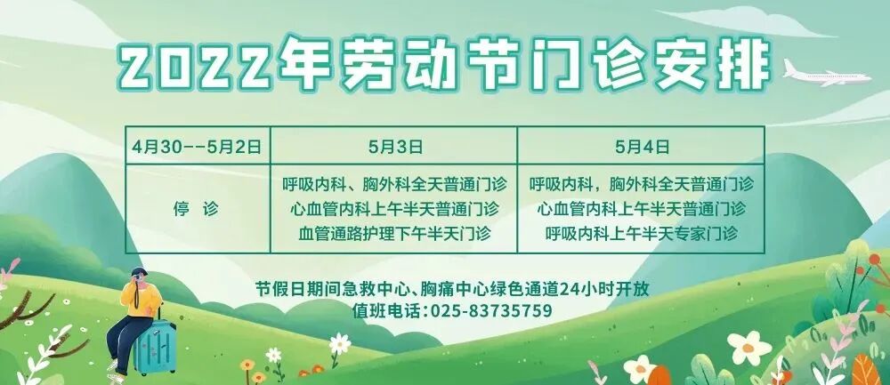 节假日期间急救中心、胸痛中心绿色通道24小时开放,值班电话:025-83735759。