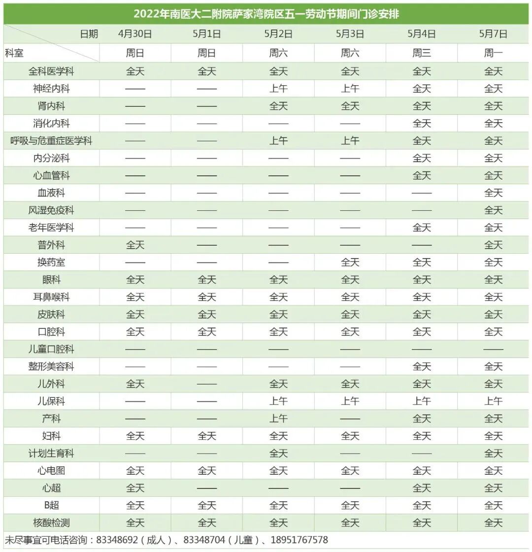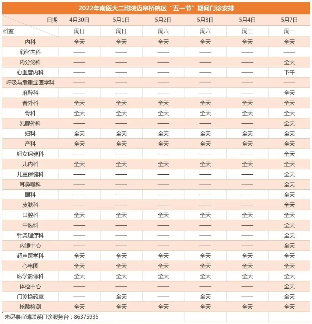 4月30日-5月4日、5月7日,南医大二附院三院区成人门诊正常开诊(含专家门诊)。
