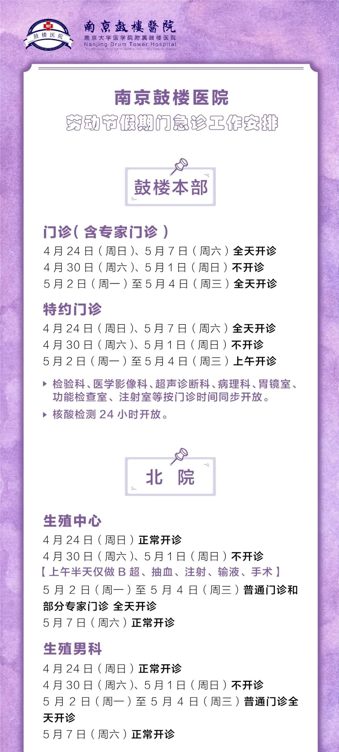 4月24日(周日):门诊开诊,专家门诊同周三。
