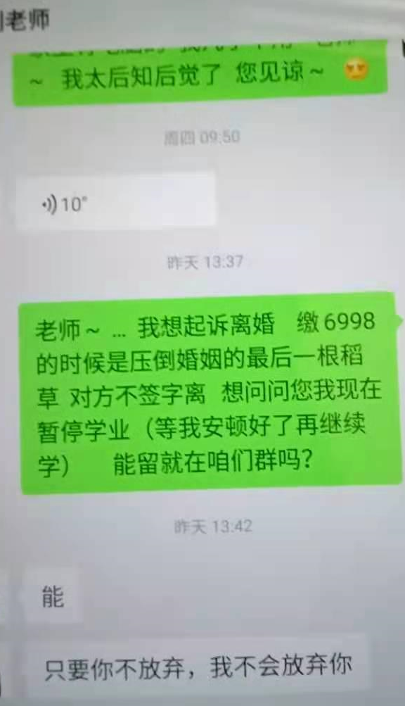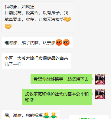 现在分享一位学员家属反馈的其妻子被微淼洗脑(PUA)后,发生的一系列的变化,本来其乐融融的家庭虽有摩擦,但是还是有滋有味的,因为妻子在学习了微淼的课程后导致对家庭的关爱缺失,一度有点着魔的情况,夫妻关系降到冰点,在一次冲突后还去民政局办理离婚,现在因为有一个冷静期的期限,后续两人关系回暖。但是这次学员的丈夫开始找寻和研究微淼的整个套路。因为妻子还是极端信任微淼,这位丈夫只能通过偷拍妻子的手机上的信息先行保存了一些证据并向警方报警后被立案。这位学员的丈夫坦言妻子的一度情况就是像小区那些老头老太太把卖保健品的年轻人当自己的亲儿子一样,而排斥自己的真正亲人。
