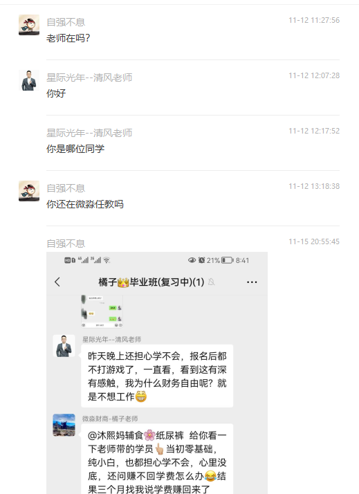 现在学员们都聪明了,在过去的群里找老师的托号以证明以前都是被诱骗而报名,掌握证据后好报警立案,今天一位学员在找托的时候发现一位托,但是这个托已经转换码头去了另一家培训机构,现在是教人画画!公开下面的信息,第一不要被教画画的机构诱骗,这个可能都是微淼入股但是不显示股权的新项目都有可能。