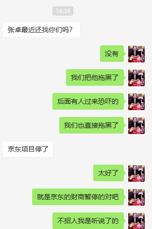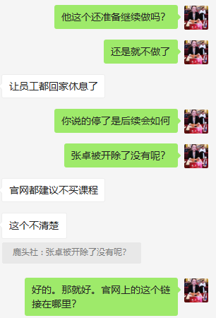 感谢京东财商课离职员工发给我们的信息,其了解到京东高层重视我们的曝光情况,已经在查相关的信息是否属实,目前其了解情况京东金融已经暂停财商课项目,并让该项目员工都回家休息了!具体该板块的负责人张卓目前去留问题不明朗!并称在京东金融的APP建议不买课程,我们下载后目前看不到相关的提示!