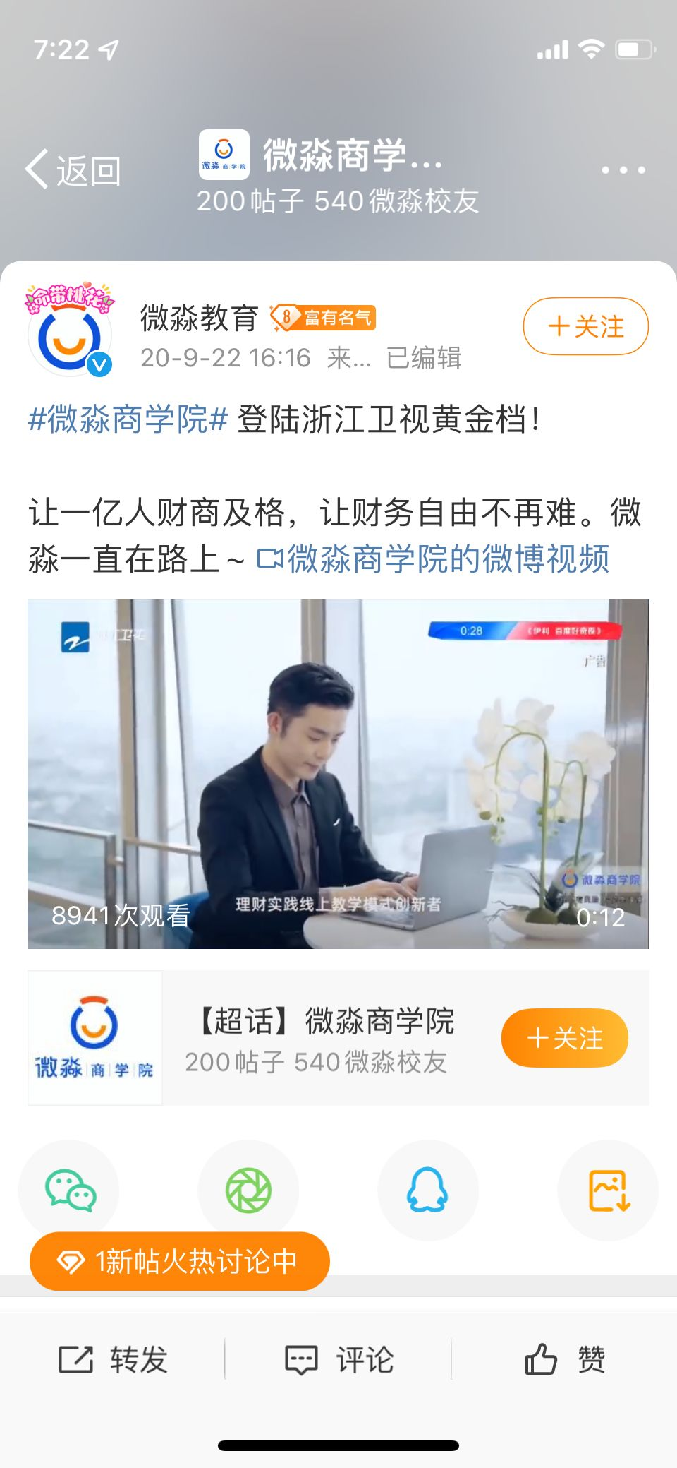 我们发出相关信息后,微淼的水军已经删除了相关信息,不过能找到2020年的浙江卫视播出微淼广告官方号的宣传!