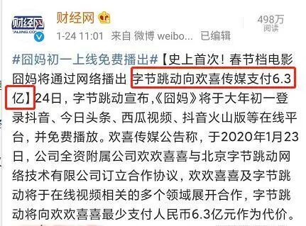 当然不是免费网播,《囧妈》卖给了字节跳动,最少6.3亿。