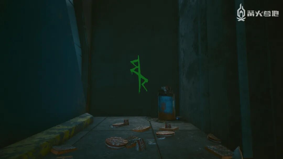 从圣多明戈河谷区的沃勒森街地铁站出来,下楼梯左转,远远就能望见「超级摩天楼 H4」,也就是大卫和母亲格洛丽亚租住的公寓。这栋超级摩天楼从外侧封锁,没有办法进入内部。在一个隐秘的角落里,我看到了喷涂在墙上的令人熟悉的标志,一旁的垃圾箱中有个超梦装置,正是动画第一集开头赛博精神病大开杀戒的片段,原来他就是在荒坂塔所处的中心广场另一边,沛卓石化大楼前的空地上闯的祸。