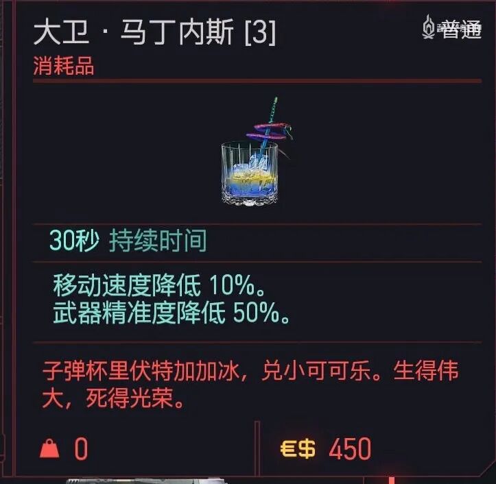 回到「来生」,坐在酒保克莱尔面前,我点了杯「大卫·马丁内斯」。「子弹杯里伏特加加冰,兑小可可乐」,大卫不喜欢碳酸饮料的味道,但露西对夜之城的小可可乐十分上头。这份融合二人喜好的酒以大卫的名字来命名,因为想要上来生的酒单,条件很简单 —— 如传奇般死去。正如这杯酒的形容那样,「生的伟大,死的光荣」。