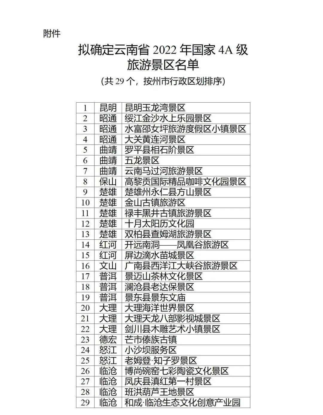 根据《旅游景区质量等级的划分与评定》(GB/T 17775-2003)国家标准和《旅游景区质量等级管理办法》要求,经各州(市)文化和旅游局初评、推荐,省文化和旅游厅按程序认真组织开展了2022年国家4A级旅游景区评定工作,昆明玉龙湾景区等29家景区达到国家4A级旅游景区的标准,拟确定为云南省2022年国家4A级旅游景区。
