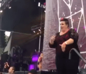 这位来自德州,有着红色留海身材胖硕的姐们儿叫做Amber Galloway Gallego,她在音乐现场干了17年,合作过的音乐人高达400多位,是全美最受欢迎的手语翻译之一。