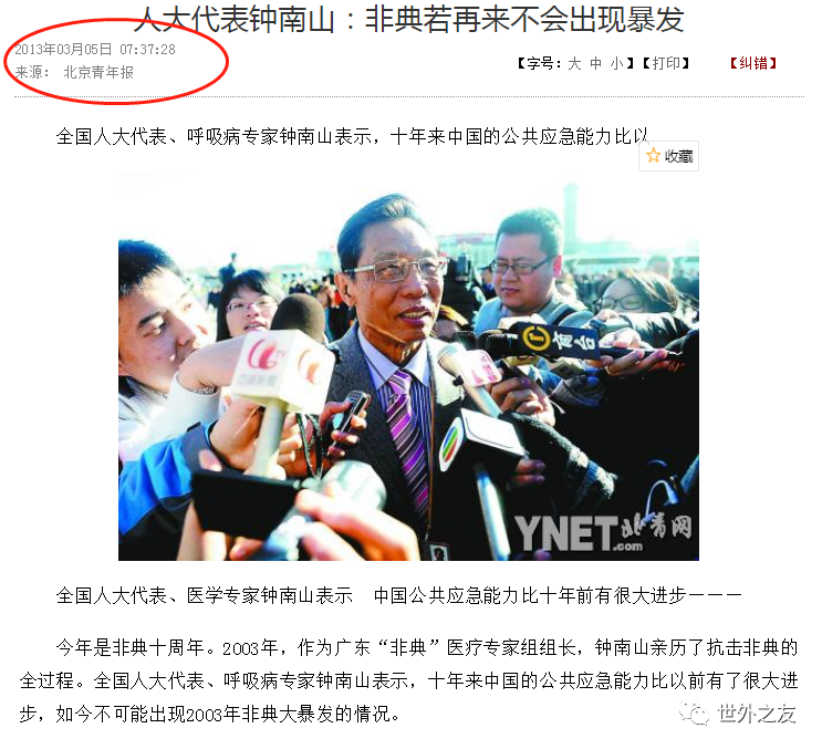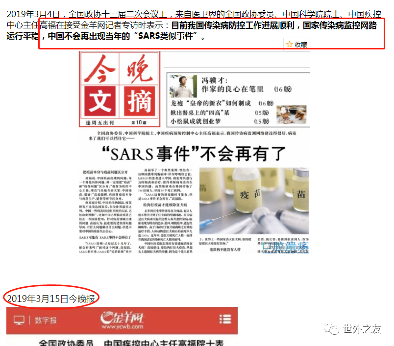 这是2019年3月15日《今晚报》记者两会期间的采访报道,全国政协委员,中国科学院院士、中国疾控中心主任高福表示:目前我国传染病防控工作进展顺利,国家传染病监控网路运行平稳,中国不会再出现当年的“SARS类似事件”……