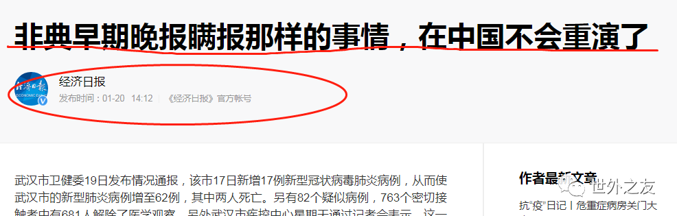 恍如隔世,让我们穿越回来。在此次疫情刚刚宣布的时候,《经济日报》于2020年1月20日在其官方账号发布的文章,标题赫然醒目:非典早期晚报瞒报那样的事情,在中国不会重演了!……