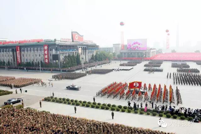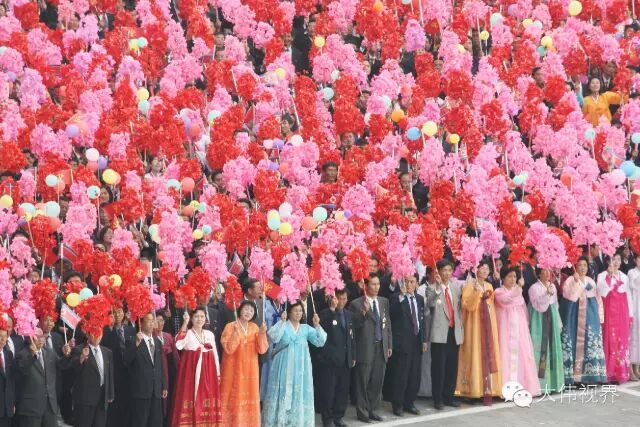 此次阅兵式受阅部队共有1.5万人,现场观看阅兵的朝鲜民众就超过了十万,他们手持红色花束,让整个金日成广场变成花的海洋。挂着写有“先军政治”、“誓死捍卫”标语的巨型红色气球在空中飞舞……