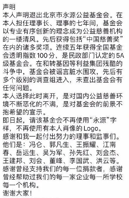 引子:连崔永元这一类公益大伽,都在反思自己的公益之路,像我们这类影响更小的民间公益人,进?还是退?7月17日晚,崔永元发表声明,宣布退出北京市永源公益基金会。声明中,崔永元披露,他之所以选择此时离开,是对国内公益慈善环境不断恶化的不满,是对基金会的前景不抱希望的宣示。