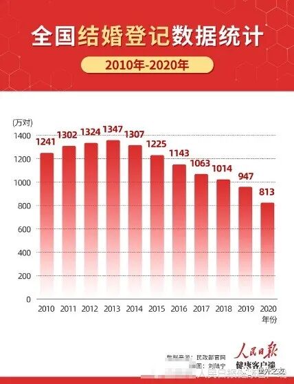 近日,2020年民政统计数据出炉,全国结婚登记人数813.1万对,同比下降12.2%。