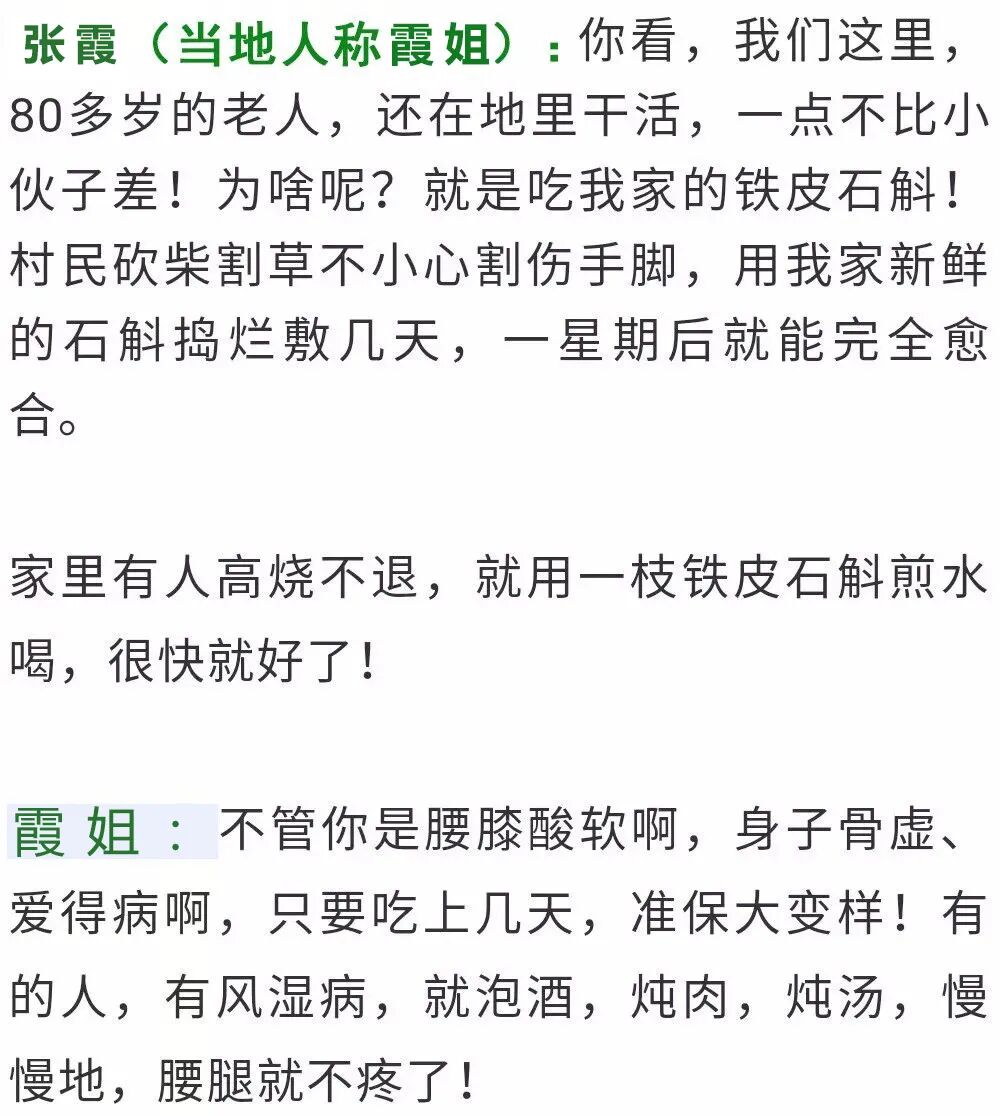 霞姐母亲:我是听我爷爷说的——以前霍山的大官,每年要给皇上进贡霍山石斛,跟皇上说,用我们家的霍山石斛,不管什么毛病,最多不超过3个月,肯定好!欺骗皇上要杀头的,对不对?他敢这么说肯定是有把握的……