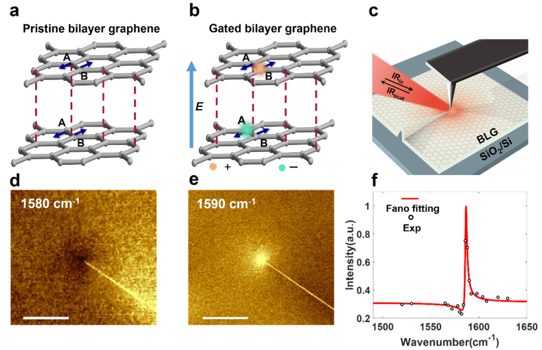 双层石墨烯局域应变的近场红外探测。a:原始Bernal堆叠的双层石墨烯原子结构示意图。本征双层石墨烯是非极性晶体,电偶极矩为零,光学声子几乎没有红外活性。b:外加电场打破了石墨烯的层间对称性,引入电偶极矩,从而激活了光学声子的红外活性。c:扫描近场光学显微镜探测局域应变的示意图。d-e:双层石墨烯局域应变的近场红外探测结果。比例尺:2微米。f:栅压调制下的双层石墨烯近场红外光谱,可以看出近场红外光谱中有一个非常尖锐的法诺共振峰。该峰具有非常大的斜率,极大地提高了应变检测的灵敏度。