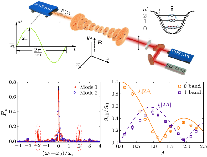 锶原子光晶格钟实现弗洛凯设计。上图:实验装置示意图。左下:在多模调制模式下,成功实现在其他阶边带激发率基本不变的条件下,独立抑制第二阶边带激发率到零。右下:选取零阶和一阶弗洛凯边带进行理论实验对比,发现对应的弗洛凯拉比频率与拉比频率之比随调制幅度变化满足理论预言的贝塞尔函数行为。