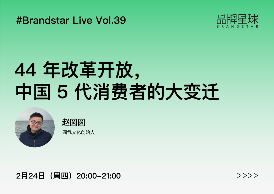 本期课程,品牌星球邀请到了圆气文化创始人、知名营销自媒体人、前淘宝直播运营负责人赵圆圆来进行《44 年改革开放,中国 5 代消费者的大变迁》的主题漫谈,内容包含: