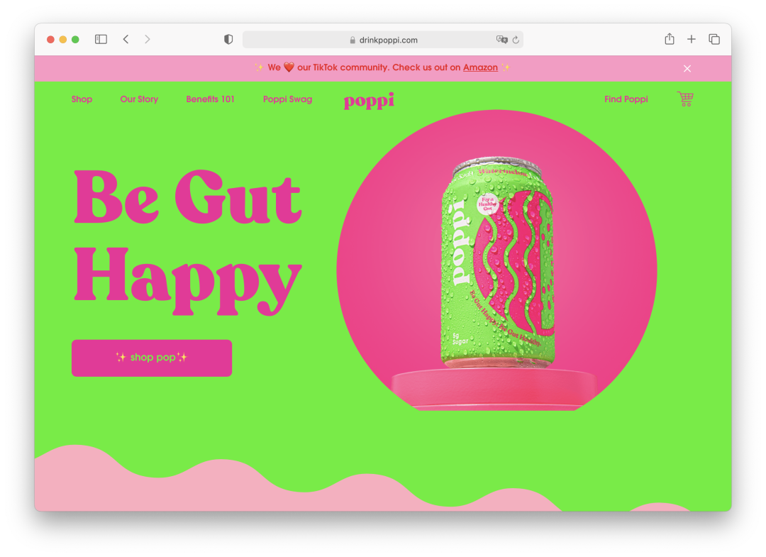 这样的包装设计不仅让 Poppi 成为了货架上引人注目的存在,也获得了 BevNet、Dieline 等公司的评奖。创始人 Allison 曾在采访中表示,「Poppi 的包装就像一件艺术品,也是饮料领域的『时尚』宣言。」除外包装外,Poppi 将这样大胆、张扬的设计风格延续在官网和社交媒体平台上,并与各种年轻新潮的品牌玩儿在一起,将张扬直接、古怪俏皮又活力四射的品牌形象一步步丰富、完善起来。● Poppi 官网的视觉设计,以及在 Ins 上与燕麦品牌「Magic Spoon」、软糖品牌「BEHAVE」的互动(向左滑动查看更多)