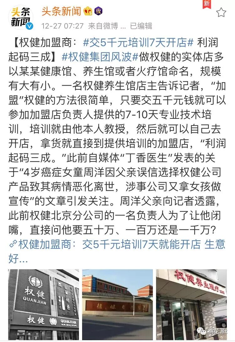 关于权健我不便说太多,主要是我了解的材料还不足以支持我下结论。在丁香医生发文爆料之前,央视新闻频道就报道过权健到底是直销还是传销。这几天因为丁香医生的文章在整个社交平台引起轩然大波,一些媒体也爆料说:在权健交5000元会费,培训7天就可以开店经营了。这怎么看怎么像传销,只是以往的传销只卖产品,权健还附带了服务和诸多看起来权威的各类秘方。