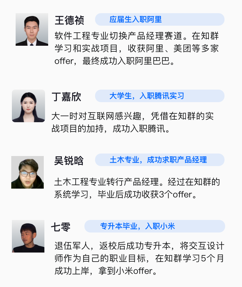 知群老师访谈了大量腾讯、阿里等一线公司的产品总监们,深度调研了他们的招聘需求和考核点。用大厂需要的能力体系打磨课程。