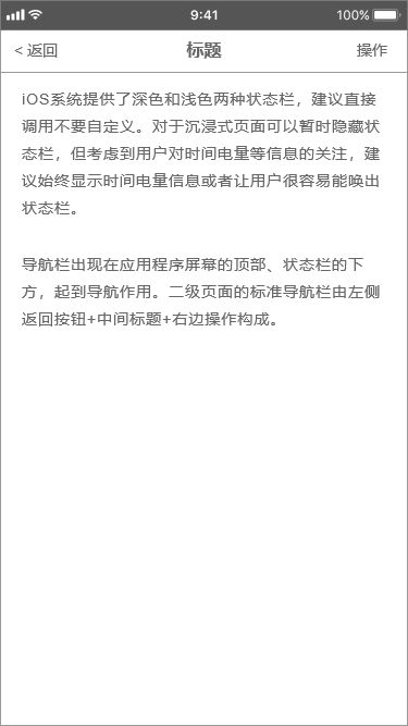 状态栏显示用户当前的移动网络信息、WiFi信号、时间、电量等,大部分情况下,需要让用户知晓这些信息,但为了沉浸式的效果,也可以隐藏。不同机型,状态栏不一样,但我们画原型时,有一个可以占位的组件就行了。![]()