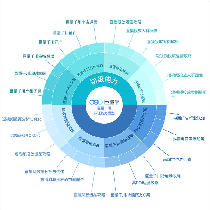 也正是在这样的背景下,为了针对性培养巨量千川营销师职业能力,规范认证考核标准,巨量引擎巨量学联合巨量千川推出《巨量引擎数字营销职业能力认证:巨量千川营销师》(以下简称《认证》),在综合分析了巨量千川投手的职业发展路径,将其分为了初级、中级和高级三个阶段。