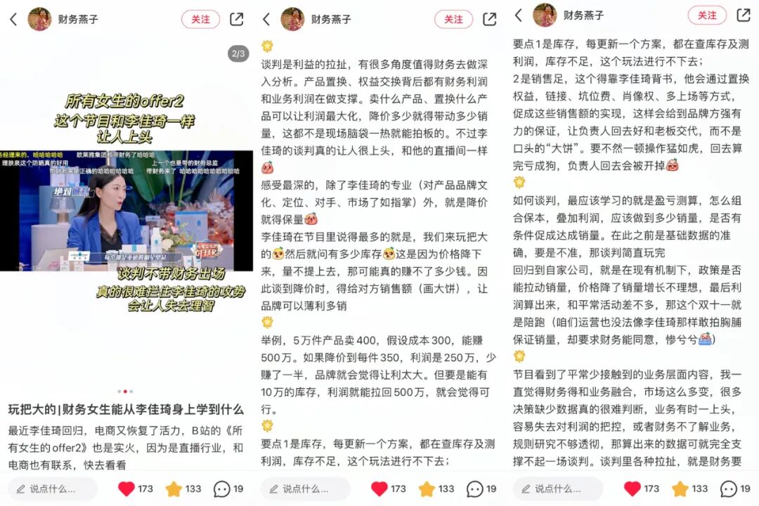 不变的是,李佳琦的砍价方式依然灵活,直击品牌痛点,再给出自己的利益诱惑点,助播的助攻效果也很明显。小红书上还有会计从业者专门总结了李佳琦的“砍价之道”,对其谈判策略表达赞赏。